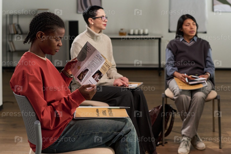 Молодая чернокожая женщина читает брошюру во время групповой терапии в помещении