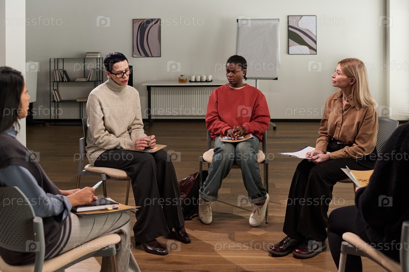 Разнообразные женщины, участвующие в групповых терапевтических сеансах внутри помещений