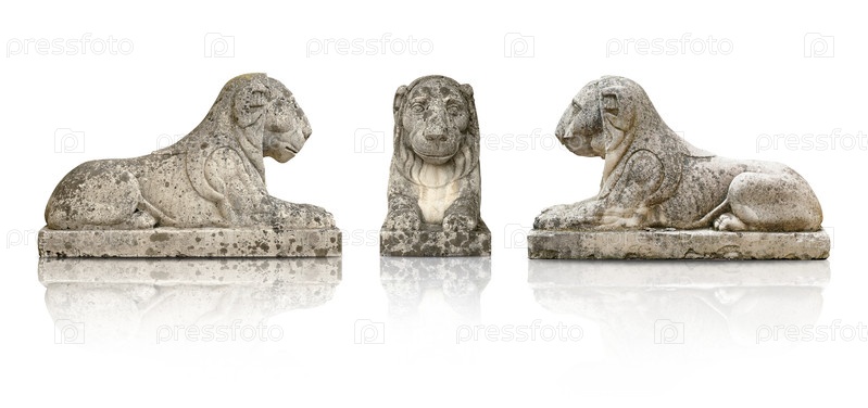 Каменные статуи львов изолированы на белом фоне