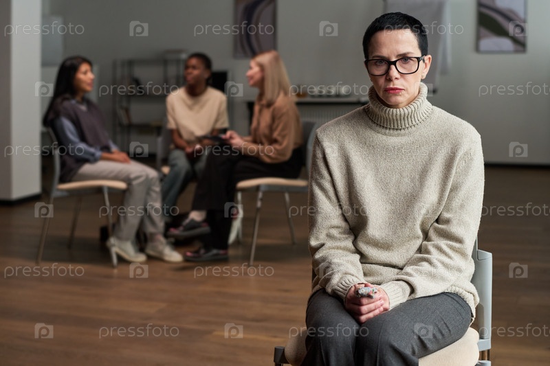 Портрет белой женщины среднего возраста, сидящей в разных группах и разговаривающей