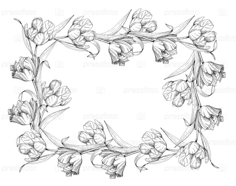 Рестангулярная рама тюльпанов. ручной чернил векторной иллюстрации тюльпана. для дизайна карточек, обложки, печатных работ, этикеток продуктов и ткани