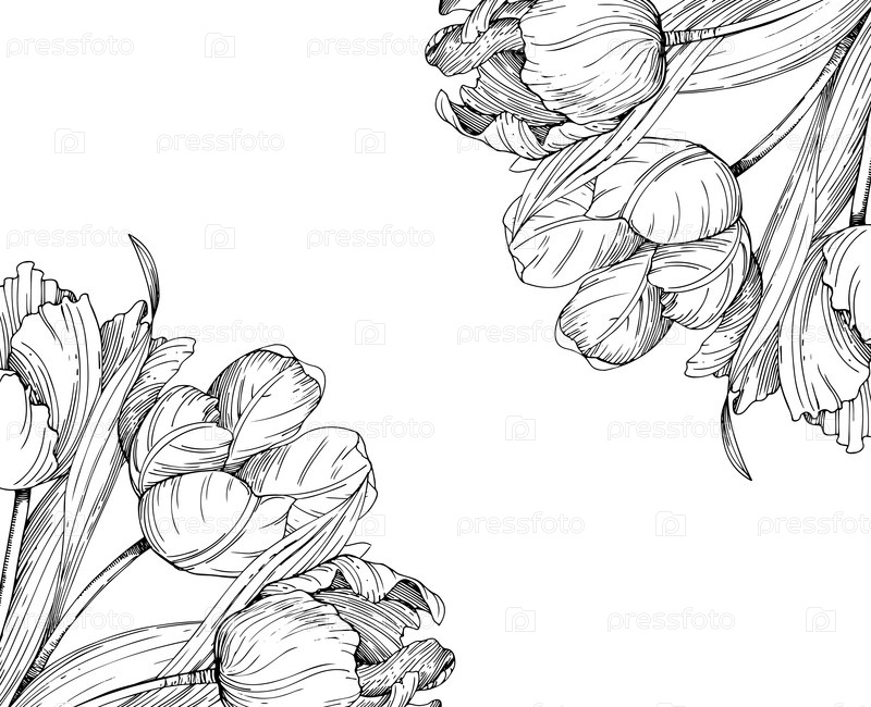 Угловая рама тюльпанов. ручной чернил векторной иллюстрации тюльпана. для дизайна карточек, обложки, печатных работ, этикеток продуктов и ткани