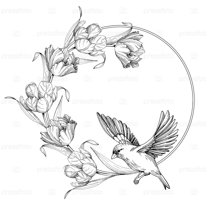 Венок тюльпанов и луки. Ручной чернил векторной иллюстрации тюльпана. Для дизайна карточек, обложки, печатных работ, этикеток продуктов и ткани