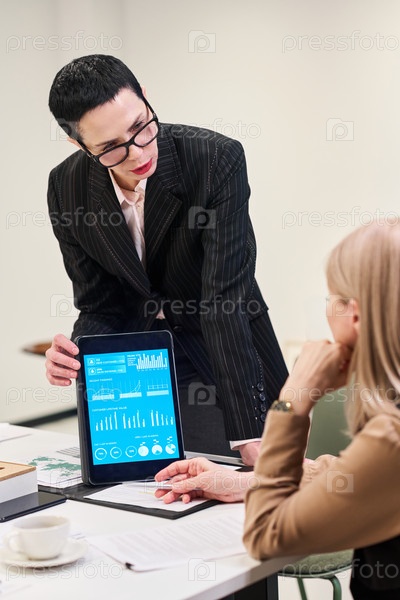 Кавказская женщина среднего возраста представляет коллеге анализ данных