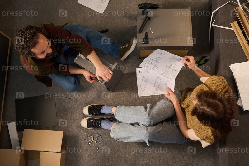 Молодая женщина и мужчина среднего возраста просматривают инструкции по сборке шаг за шагом
