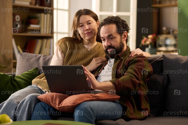 Молодая взрослая пара сидит вместе, используя ноутбук дома