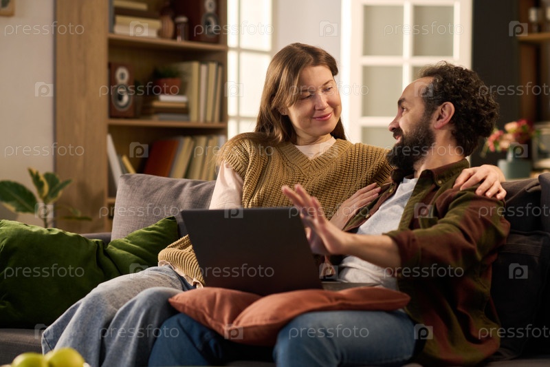 Молодая взрослая пара отдыхает вместе с помощью ноутбука дома