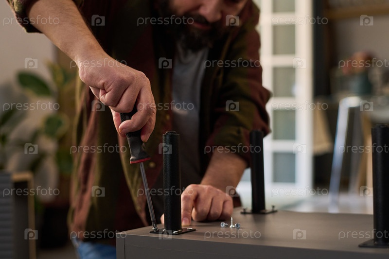 Мужчина среднего возраста собирает мебель с помощью отвертки в помещении