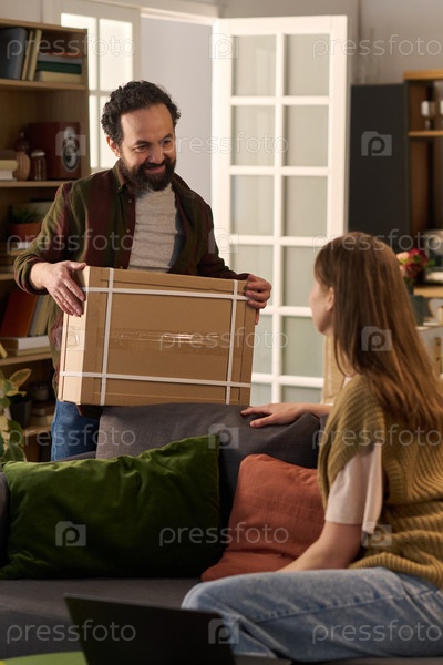 Мужчина средних лет дает посылку молодой взрослой женщине