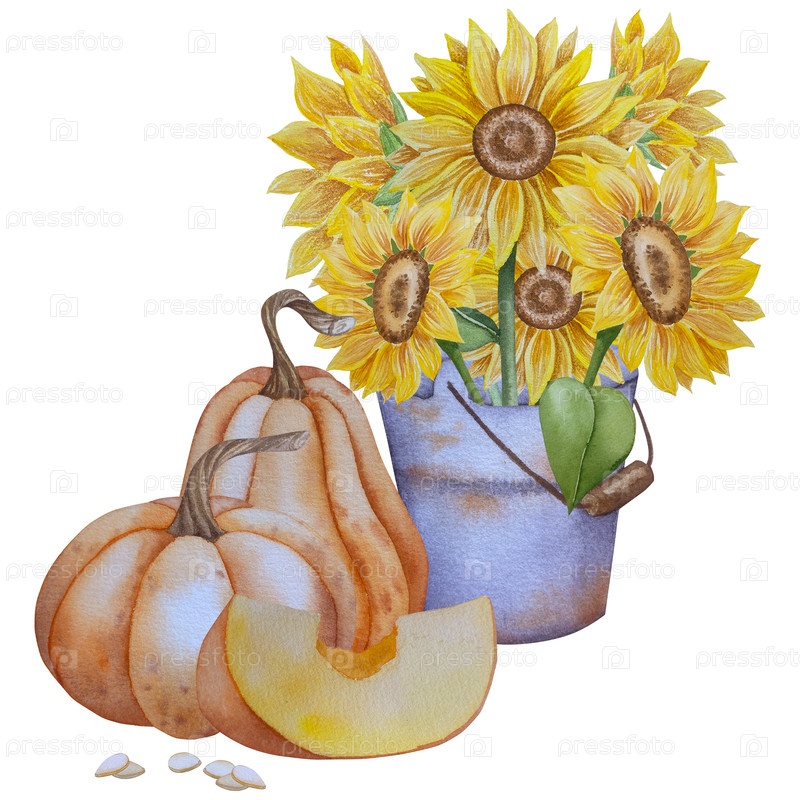 Коллекция осенних элементов. Осенние композиции с тыквами, кленовыми листьями, подсолнечником, ржи. Акварельная иллюстрация урожая Дня благодарения. Ручной рисунок для дизайна, печати, Хэллоуина, дня благодарения, социальных сетей