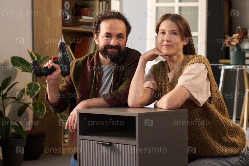 Портрет мужчины среднего возраста и молодой женщины, позирующих после собрания