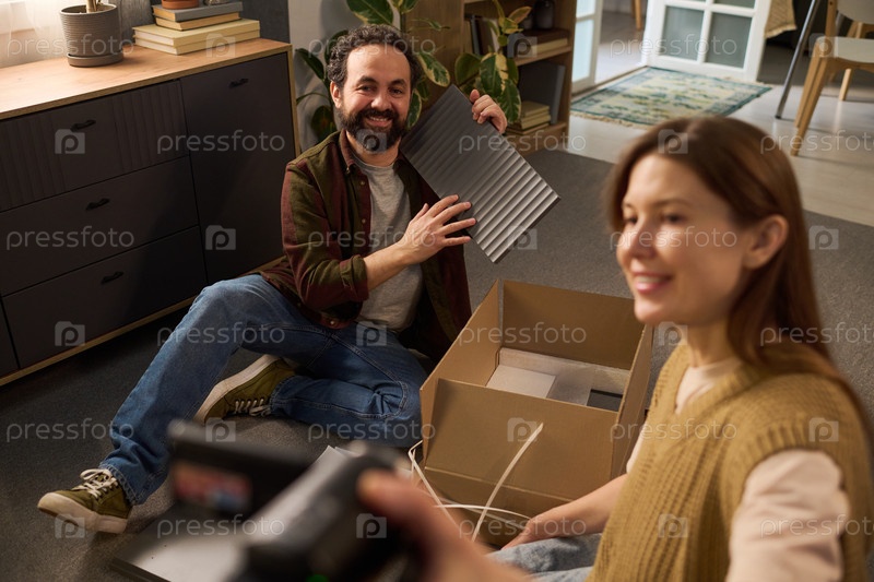 Молодой взрослый мужчина улыбается, разрабатывая коробку для переезда дома