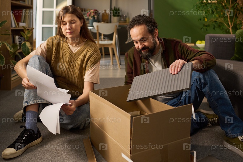 Молодая женщина и мужчина среднего возраста собирают мебель вместе