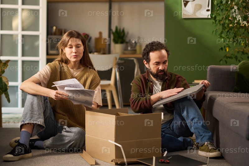 Молодая женщина и мужчина среднего возраста строят мебель плоского комплекта вместе