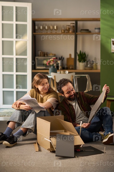Молодая женщина и мужчина среднего возраста улыбаются, когда вместе строят полку