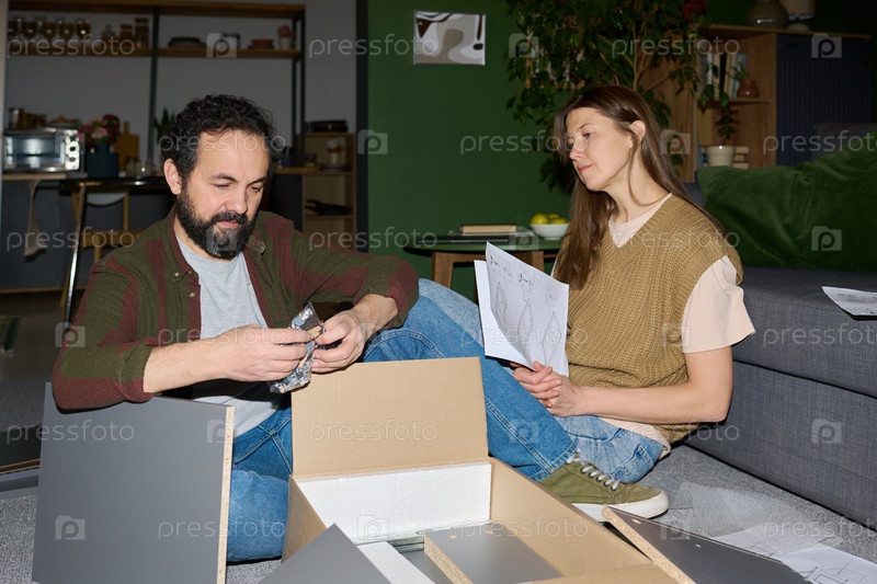 Молодой взрослый мужчина собирает мебель, а женщина читает инструкции