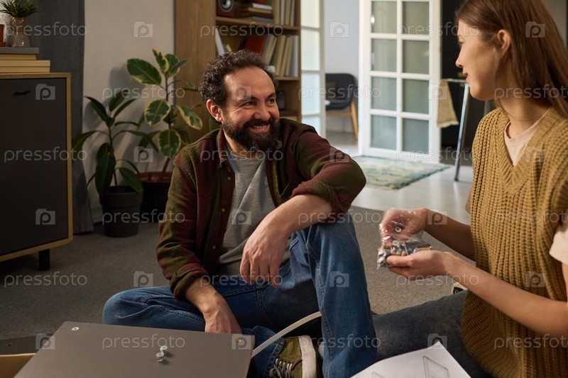 Мужчина среднего возраста улыбается, пока молодая женщина собирает мебель