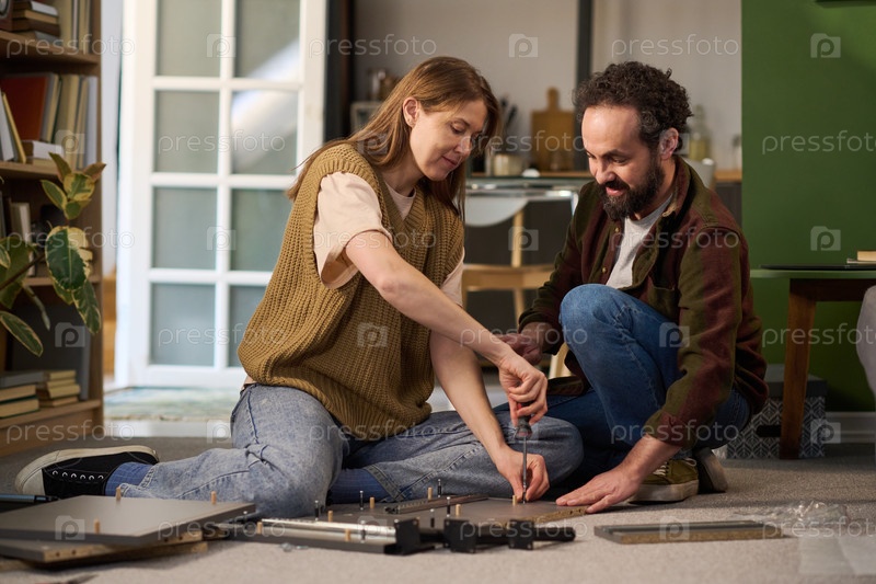Молодая женщина и мужчина среднего возраста собирают мебель вместе в помещении