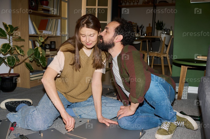 Молодая женщина улыбается, пока молодой человек целует ее в щеку