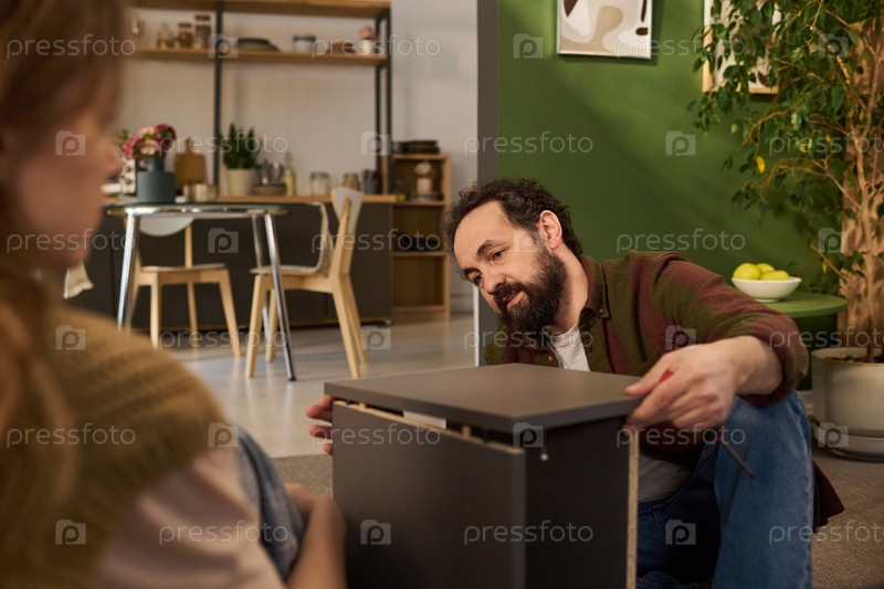Мужчина средних лет собирает мебель, разговаривая с женщиной