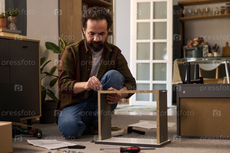 Мужчина среднего возраста концентрируется, закрепляя винты во время сборки