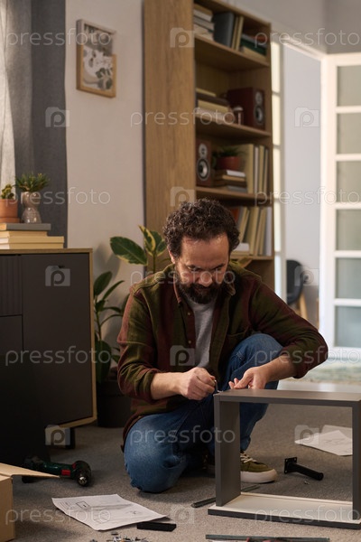 Мужчина средних лет собирает мебель в современной гостиной