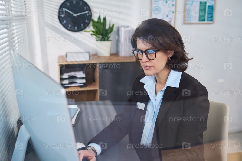 Женщина средних лет, работающая на компьютере в офисе Visa Center