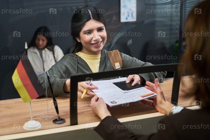 Молодая взрослая испаноязычная женщина подает заявление на визу в визовом центре