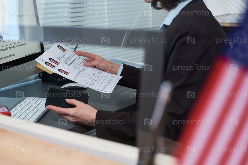 Женщина среднего возраста, обрабатывающая визовые заявления на столе Визового центра