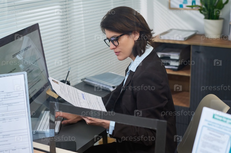 Женщина среднего возраста просматривает документы на приеме в визовом центре