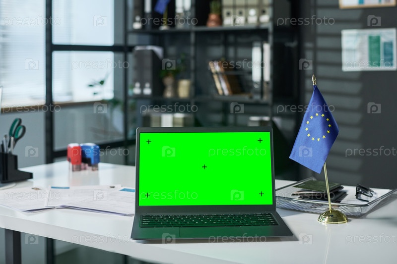 Ноутбук с зеленым экраном отображается на рабочем столе в офисе Visa Center Office Workspace