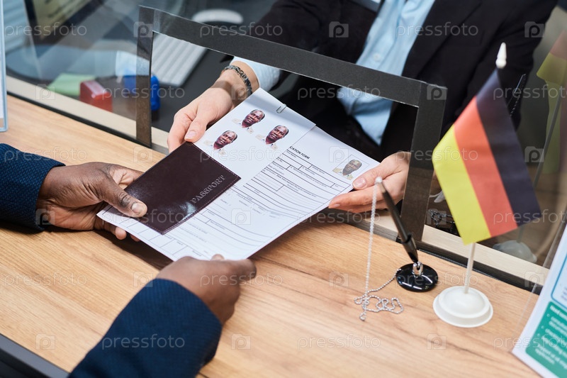 Женщина, обрабатывающая заявку на паспорт для чернокожего мужчины в визовом центре