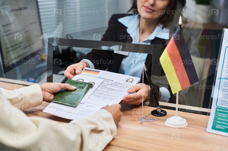 Обработка документов для молодой взрослой женщины на стойке Visa Center
