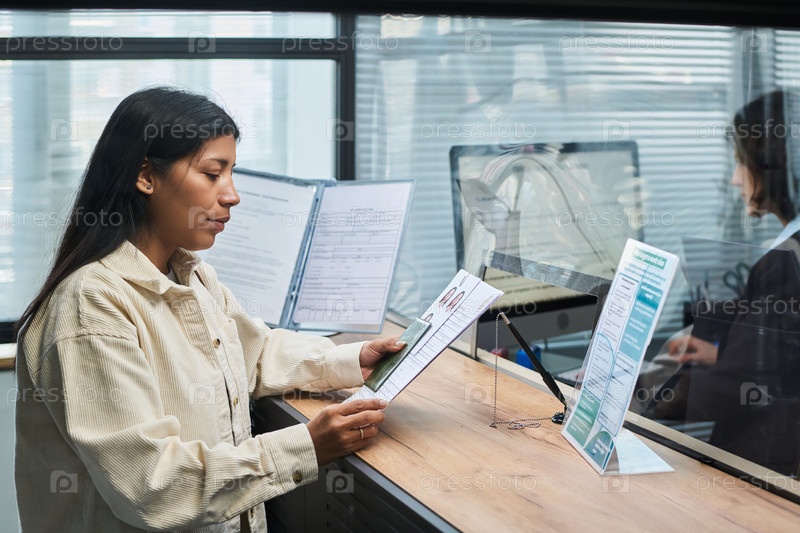 Молодая взрослая испаноязычная женщина рассматривает формы заявлений на стойке Visa Center
