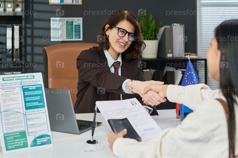 Молодая взрослая женщина помогает латиноамериканской молодой взрослой женщине на рабочем столе Visa Center