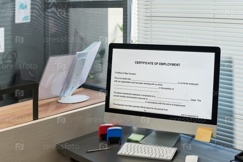 Компьютерный монитор отображает Свидетельство о трудоустройстве Документ в визовом центре