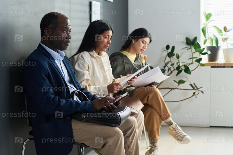 Чернокожий мужчина среднего возраста и две женщины ждут в зоне приема визового центра