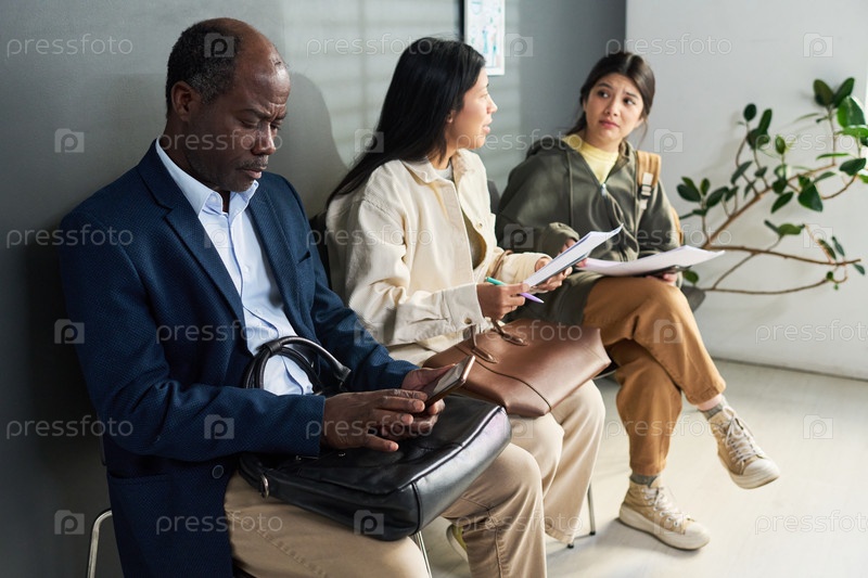 Чернокожий мужчина средних лет и две молодые взрослые женщины ждут в визовом центре