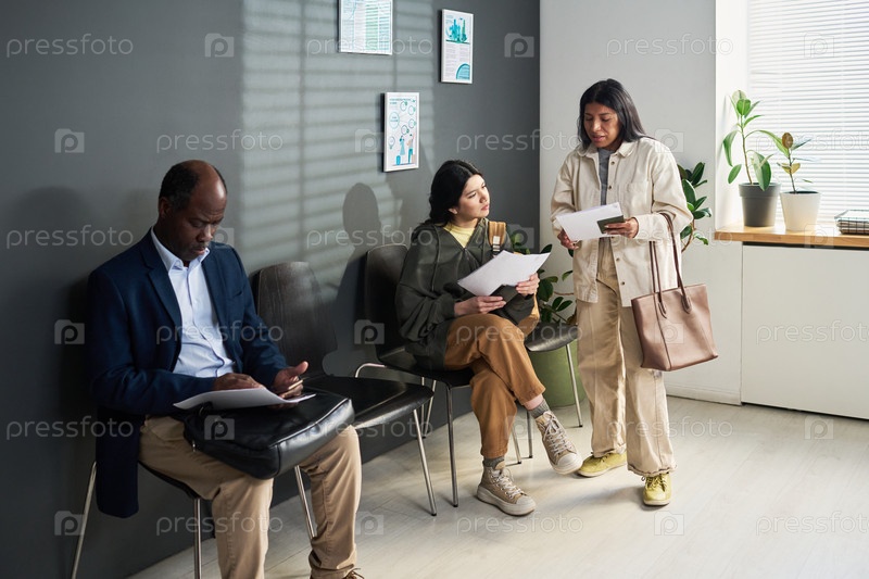 Мультиэтнические взрослые ждут и обсуждают документы внутри офиса Визового центра