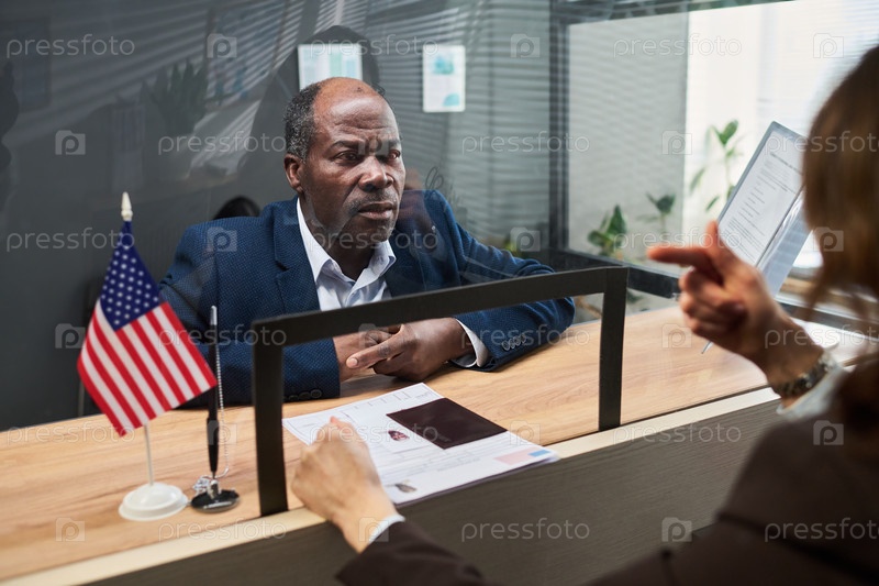 Чернокожий мужчина среднего возраста консультирует визовый центр Сотрудник при сервисном стойке
