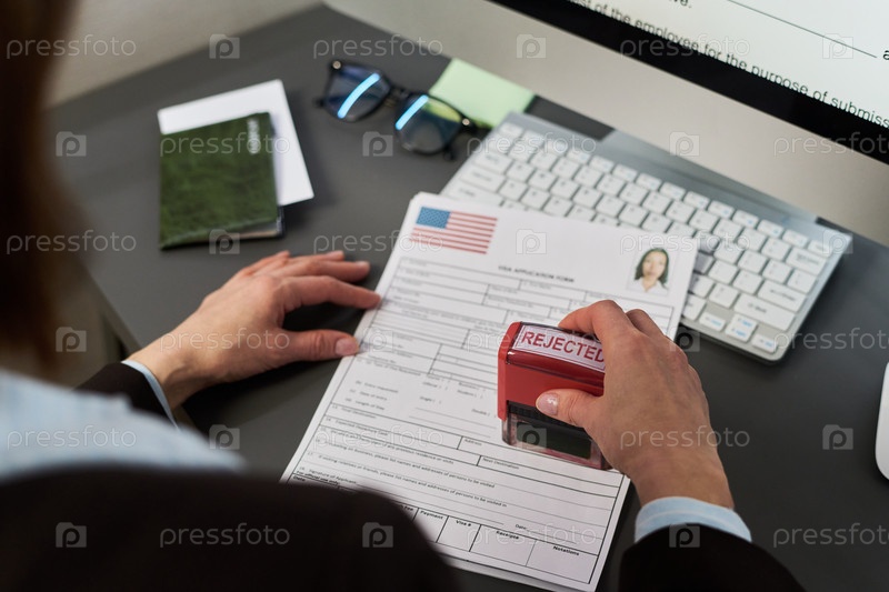 Женщина обрабатывает заявление на визу и печатает отклоненный документ