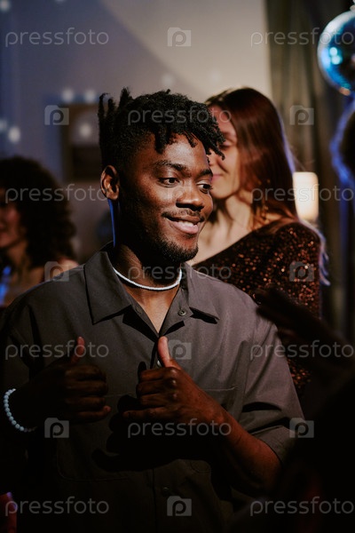 Молодой чернокожий мужчина улыбается и жестикулирует Пальцы вверх на вечеринке с друзьями