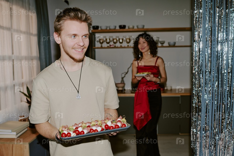 Молодой белый мужчина, несущий поднос с закусками на общественной встрече в помещении
