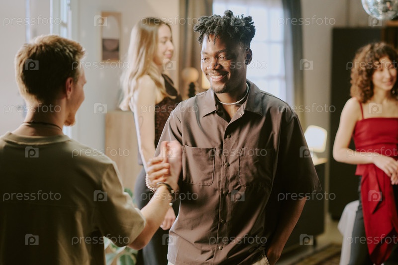 Молодые взрослые мультиэтнические друзья общаются и приветствуют друг друга в помещении
