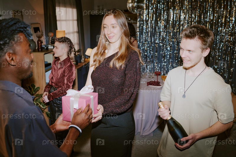Молодая кавказская женщина получает подарочный ящик от чернокожего мужчины во время празднования вечеринки