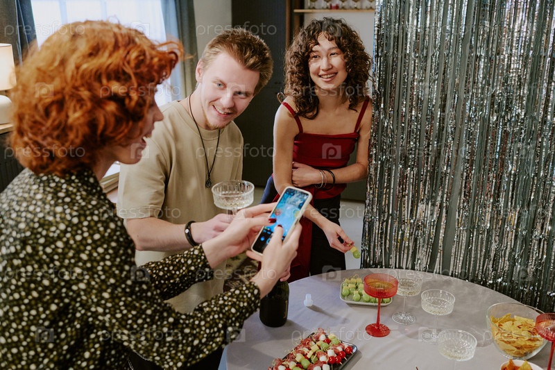 Молодой белый мужчина и две молодые белые женщины фотографируются на вечеринке