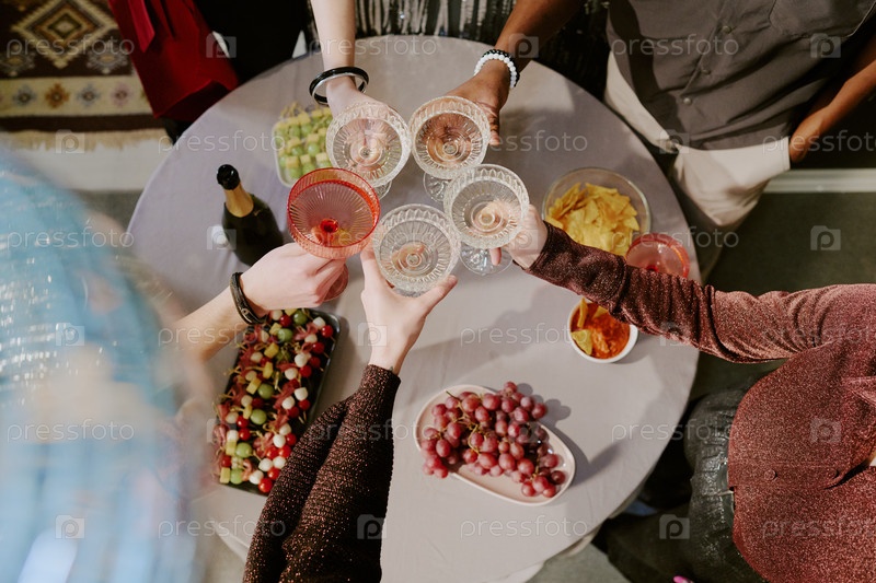 Разнообразная группа молодых взрослых приносят тосты с напитками во время праздничного собрания