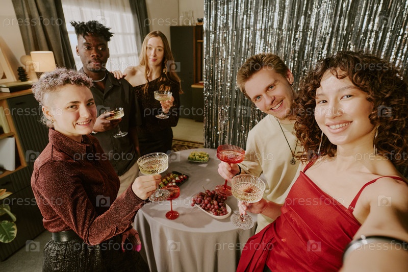Группа молодых мультиэтнических взрослых, улыбающихся и выпивающих на праздничной вечеринке
