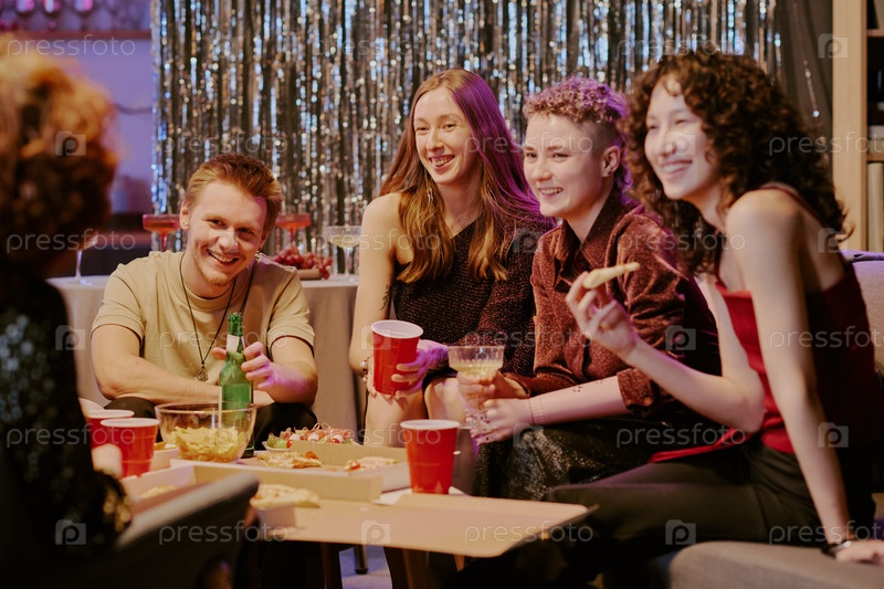 Группа многонациональных молодых взрослых, общающихся и едящих пиццу на вечеринке