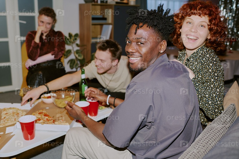 Группа друзей молодых взрослых, общающихся и едящих пиццу на домашнем собрании